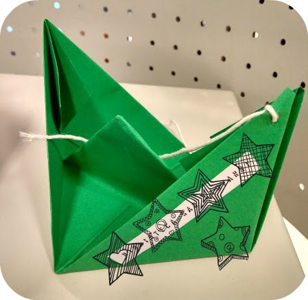 Ho legato un cordoncino a un'estremità di ogni barchetta e le ho appese in diverse aree della biblioteca.